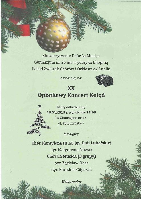 10 stycznia mieliśmy przyjemność gościć w Gimnazjum nr 16 im. Fryderyka Chopina w Lublinie i śpiewać wraz z chórem La Musica podczas XX edycji Koncertów kolędowych pt. „Spotkania opłatkowe”. Wśród prezentowanych przez nas kolęd znalazły się takie utwory jak: „Zaśpiewam Jezuskowi”, „Wśród nocnej ciszy”, „Oj maluśki maluśki” czy ukraiński „Szczedryk”. Licznie zgromadzona publiczność przyjęła koncert bardzo ciepło i nagrodziła występy brawami. Cała impreza zakończyła się wspólnym wykonaniem kolędy „Bóg się rodzi” oraz spotkaniem opłatkowym, pełnym wzruszających momentów i ciepłych słów.