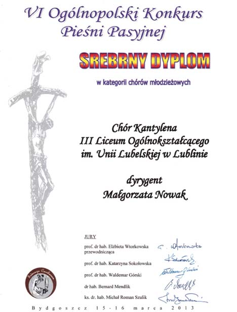 VI Ogólnopolski Konkurs Pieśni PasyjnejW dniach 15 - 16 marca 2013 odbył się w Bydgoszczy VI Ogólnopolski Konkurs Pieśni Pasyjnej. Wziął w nim udział chór Kantylena, prezentując się wśród 27 zespołów dziecięcych, młodzieżowych i akademickich przybyłych z całego kraju. W kategorii chórów młodzieżowych Jury Konkursu przyznało Kantylenie Srebrny Dyplom. |